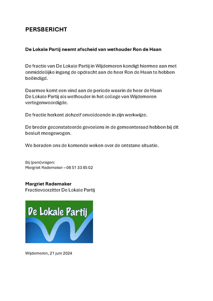 Wijdemeren, 3 juli 2024 – Verrast zijn wij door het bericht dat Marjan Pronk heeft besloten de fractie van De Lokale Partij te verlaten. Lees hier het persbericht.