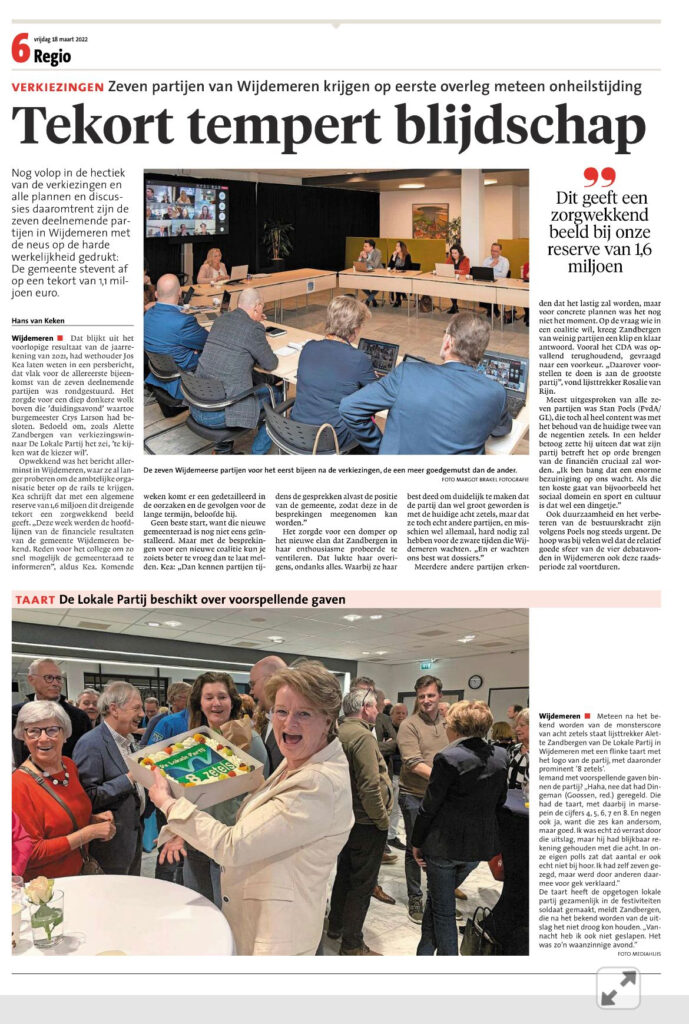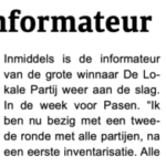 Uiteraard is er belangstelling naar het feit hoe de informatiefase in Wijdemeren verloopt. Een tweede ronde individuele gesprekken met alle partijen liep tot en met donderdag 21 april door. De eerder geuite voorzichtige indicatieve planning was erop gericht maandag 25 april de jongste voortgang te melden. Dat loopt iets uit. Er is toch wat meer tijd nodig. Dat heeft mede te maken met de inmiddels door de gemeente beschikbaar gestelde meest actuele informatie over de staat van de organisatie alsmede de financiële positie van de gemeente en de beschikbaarheid van sommige gesprekspartners. Planning is nu dat kort na Koningsdag bekendmaking volgt met welke twee partijen De Lokale Partij de gerechtvaardigde verwachting heeft een daadkrachtig college te vormen. En die verwachting moet natuurlijk gedeeld worden door de beoogde partners. Daarmee is dan fase 2 afgesloten.