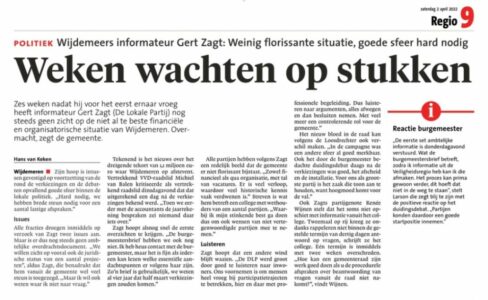 Wijdemeers informateur Gert Zagt wacht al weken op cruciale stukken: Weinig florissante situatie, goede sfeer hard nodig