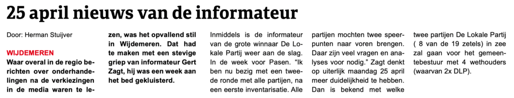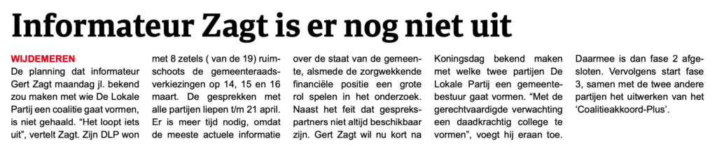 Uiteraard is er belangstelling naar het feit hoe de informatiefase in Wijdemeren verloopt. Een tweede ronde individuele gesprekken met alle partijen liep tot en met donderdag 21 april door. De eerder geuite voorzichtige indicatieve planning was erop gericht maandag 25 april de jongste voortgang te melden. Dat loopt iets uit. Er is toch wat meer tijd nodig. Dat heeft mede te maken met de inmiddels door de gemeente beschikbaar gestelde meest actuele informatie over de staat van de organisatie alsmede de financiële positie van de gemeente en de beschikbaarheid van sommige gesprekspartners. Planning is nu dat kort na Koningsdag bekendmaking volgt met welke twee partijen De Lokale Partij de gerechtvaardigde verwachting heeft een daadkrachtig college te vormen. En die verwachting moet natuurlijk gedeeld worden door de beoogde partners. Daarmee is dan fase 2 afgesloten.